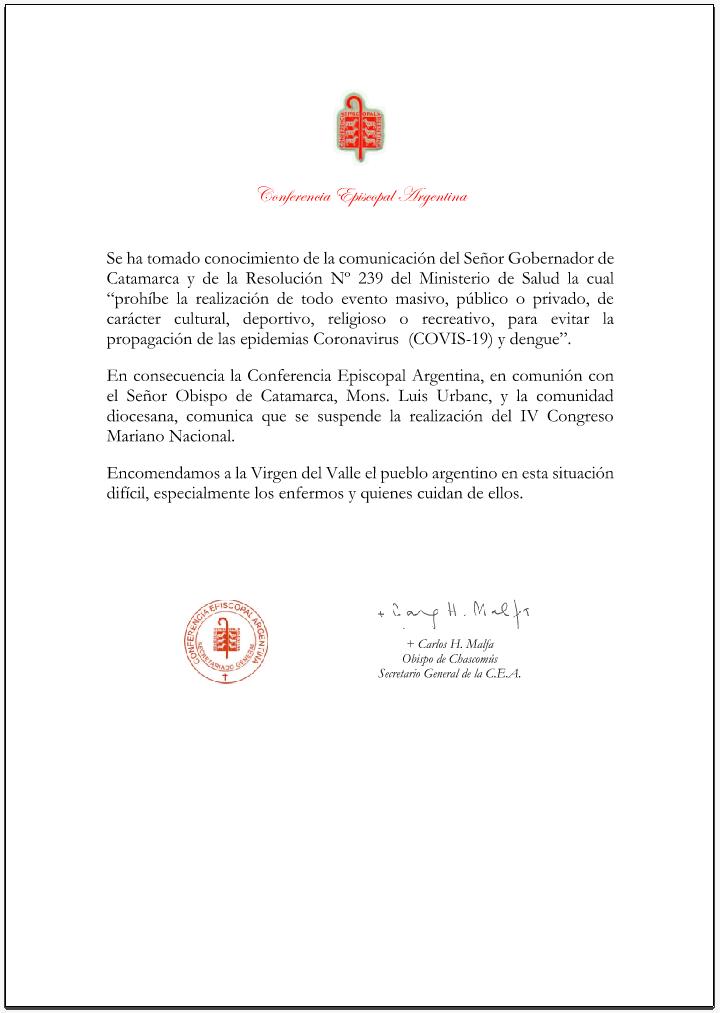 Comunicado Suspensión IV Congreso Mariano Nacional