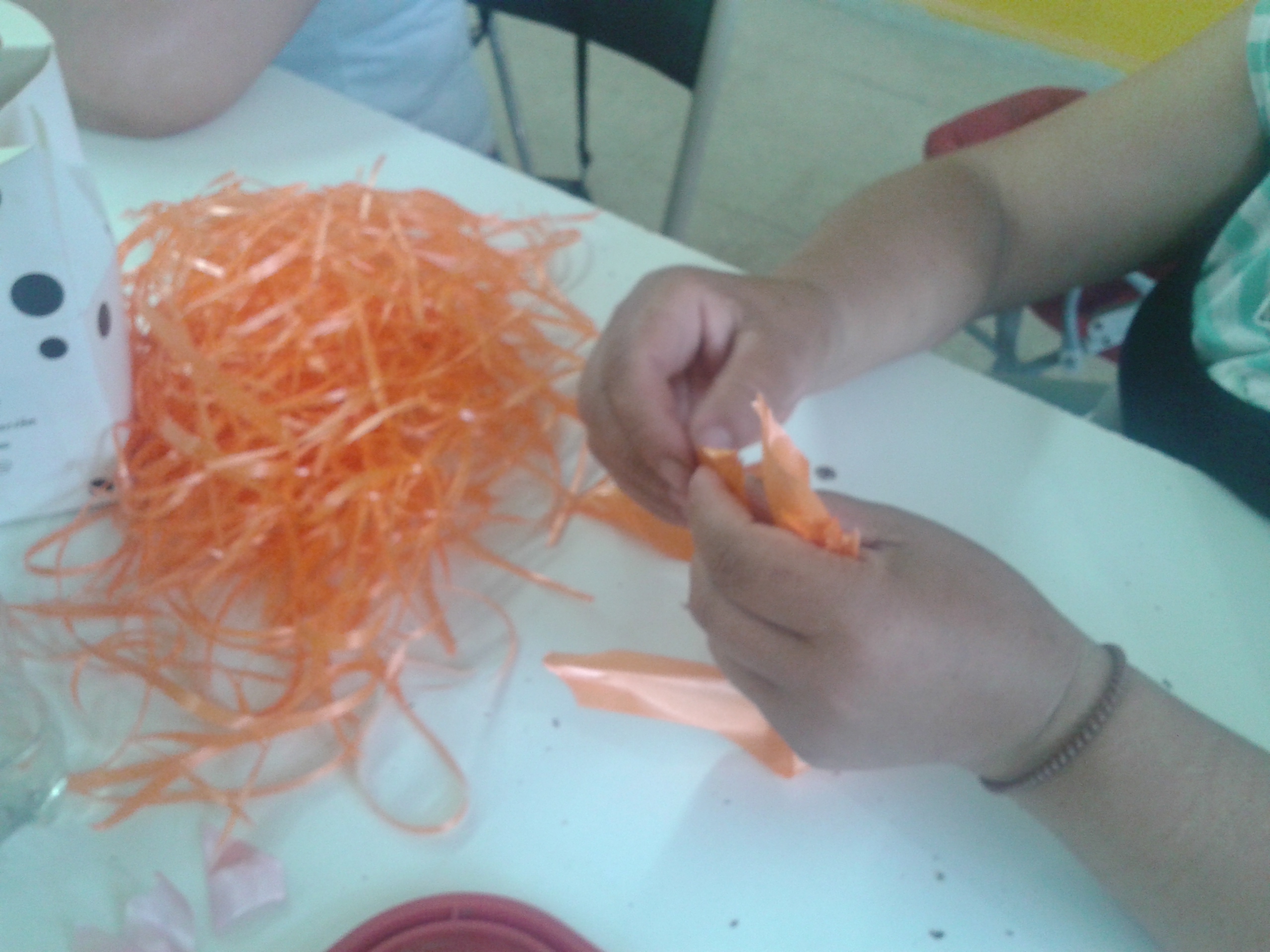 “..Vino una tarde Susana que era secretaria (pertenece al equipo de la Florería), y me enseñó una cinta de ribonet hecha una flor, muy pequeñita, entonces me dijo: tienes que aprender a hacer esta flores porque son para la Virgen, entonces yo la mire y le dije: Susana y vos piensas que vamos a poder?.. bueno le dije, dame, voy a intentarlo, por supuesto que estuve toda una tarde y debo haber hecho 4, y había que hacer, por lo menos yo calculaba 200 y no me salían y no me salían… entonces comenzamos con Martita que estaba a cargo de la biblioteca, vuelvo y le digo a Susana: mira Susana no, no sale, y me dice mira si sale, las chicas me han enseñado a mí en la florería de la Catedral, le pregunté entonces: Susana cuando me va a salir?. Cuando hagas 1000, me contestó ella. Por Dios! Así.. cuando hagas 1000! . Entonces le digo a Marta: ay, mira Marta esto no me sale, como podríamos hacerle los rulitos…