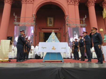 En el Paseo de la Fe la esperaban autoridades locales, particularmente de las fuerzas de seguridad y los fieles devotos que estallaron de júbilo ante su presencia, con pañuelos en alto y la emoción en sus rostros.