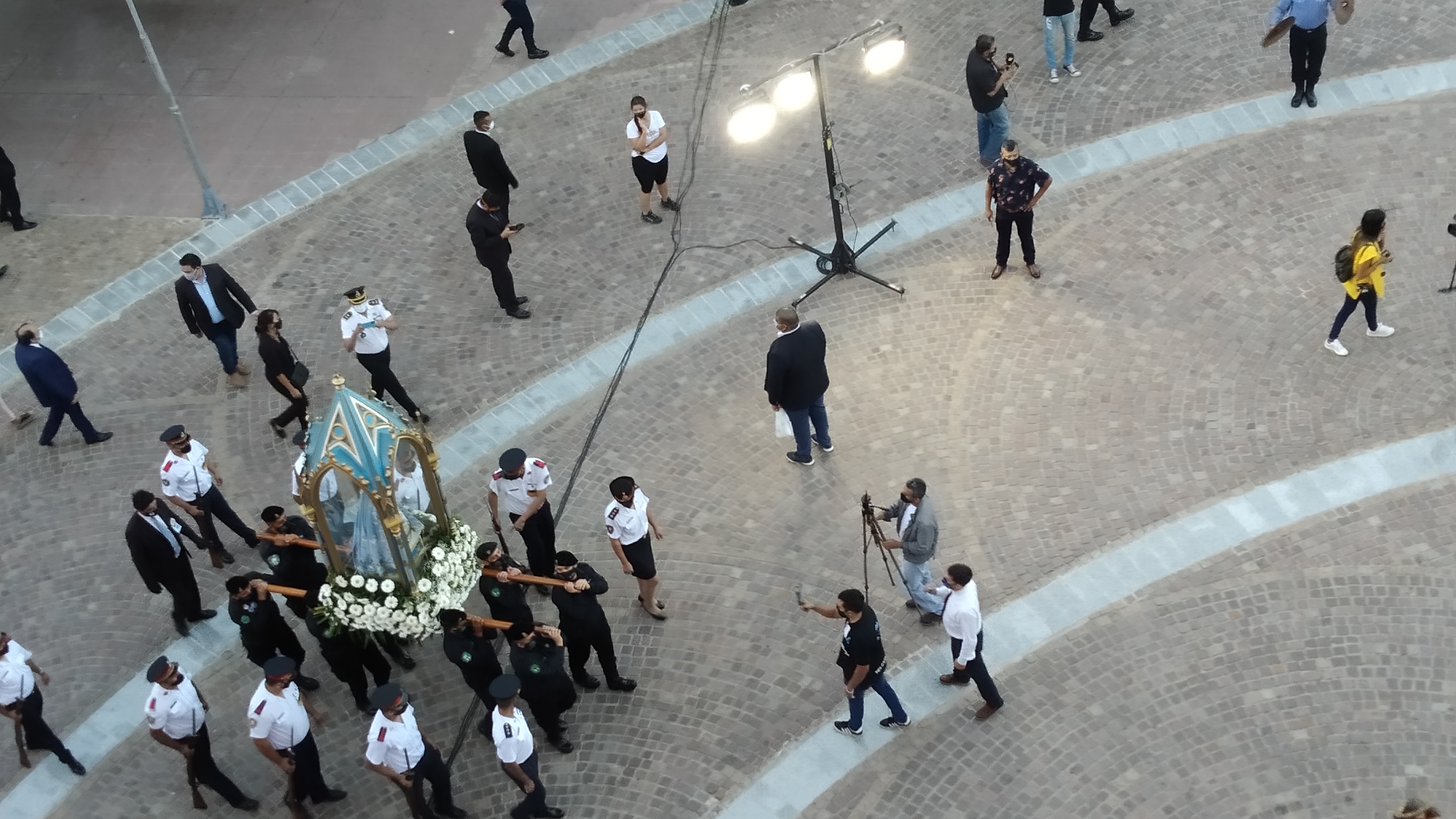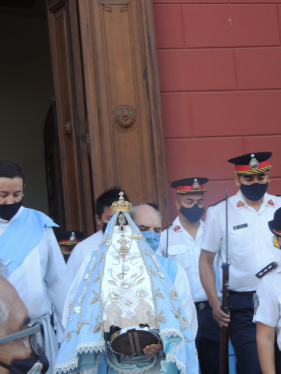 Integrantes de la Brigada contra Incendios Forestales y de Defensa Civil -con sus coloridos uniformes amarillos y naranjados- tuvieron el privilegio de llevar en sus hombros a la Patrona de Catamarca, en el inicio de la Procesión, siendo luego relevados en el trayecto alrededor de la plaza 25 de Mayo, sucesivamente, por miembros de la Guardia de Infantería y Grupo Kuntur de la Policía de la Provincia, Policía Federal y Servicio Penitenciario Provincial.