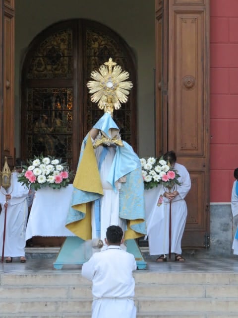 Tras una hora de caminata, cuando la Imagen arribaba a la esquina de Sarmiento y República, se vivió una emotiva escena al ver a Cristo Sacramentado ir hacia su Madre y su padre adoptivo. Llegando al Paseo de la Fe echaron a vuelo las campanas, cuyo sonido se confundía con vivas y aplausos.