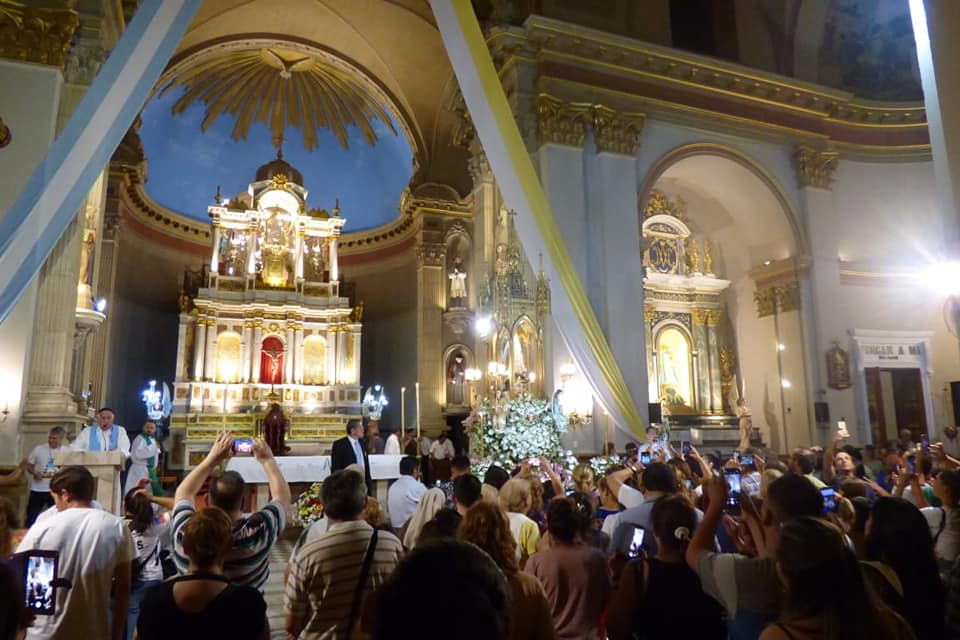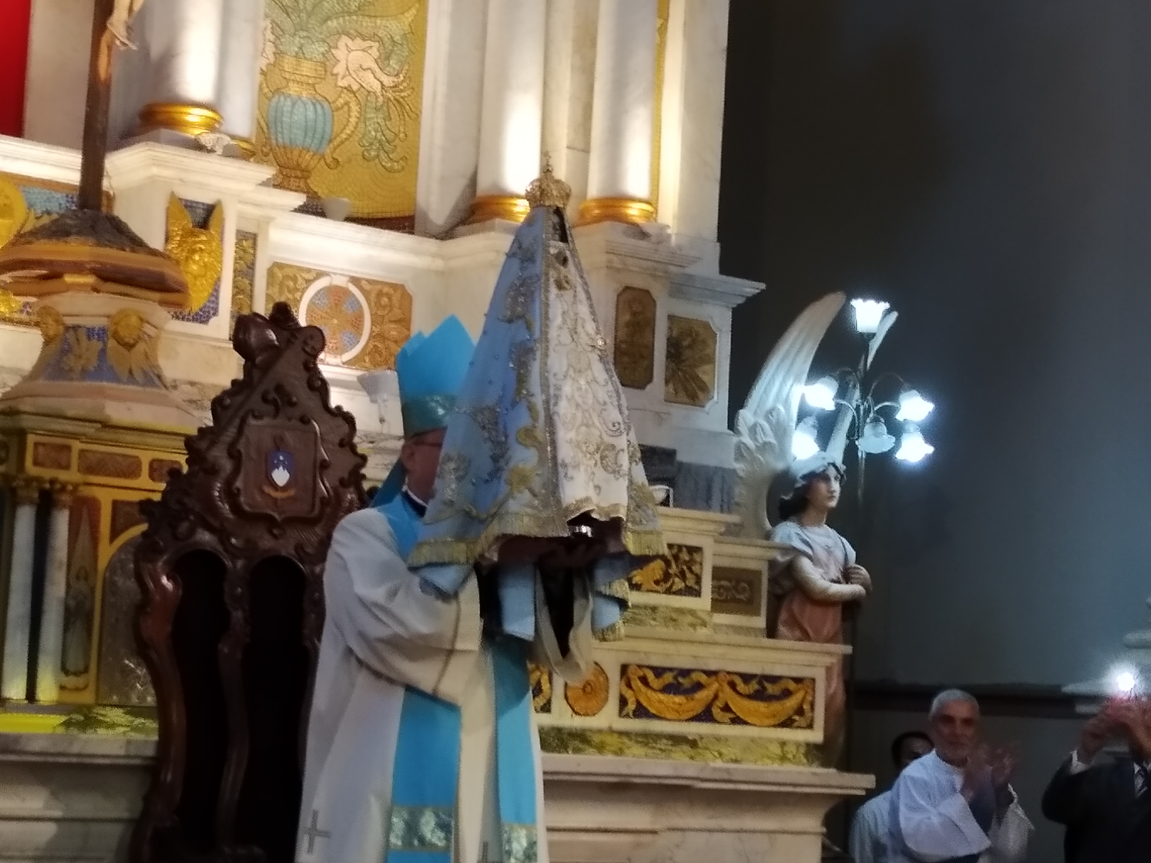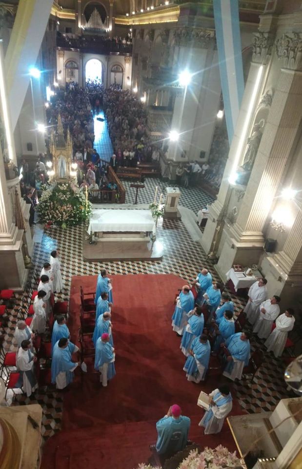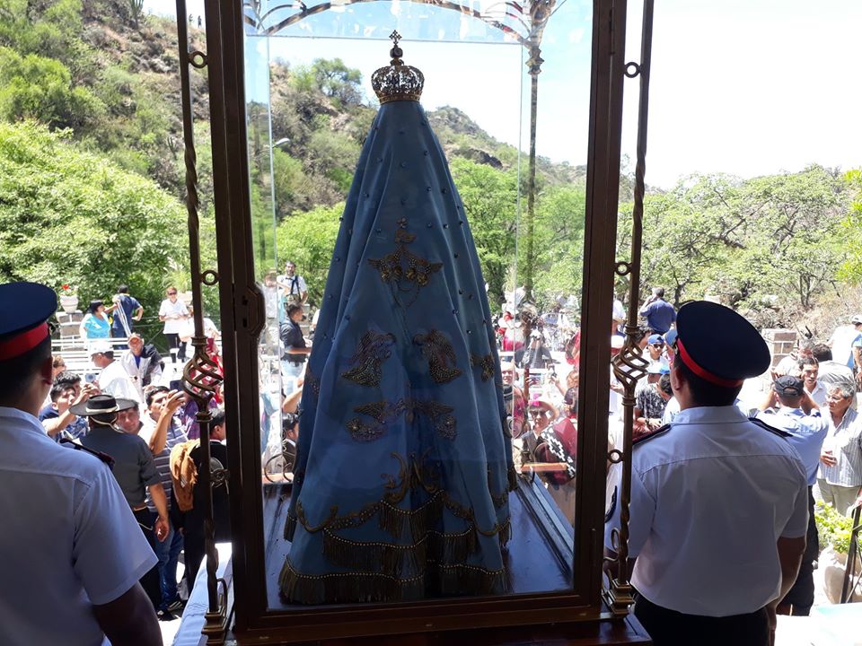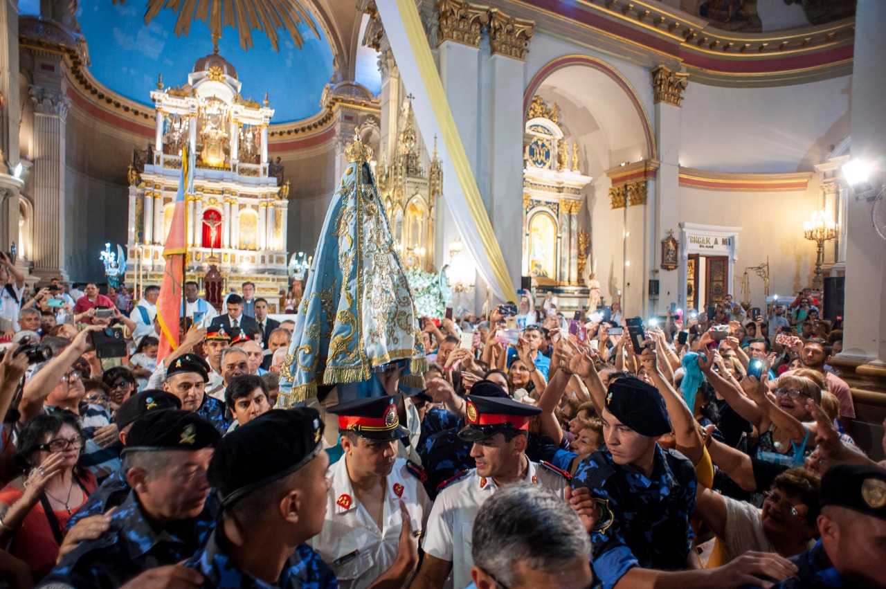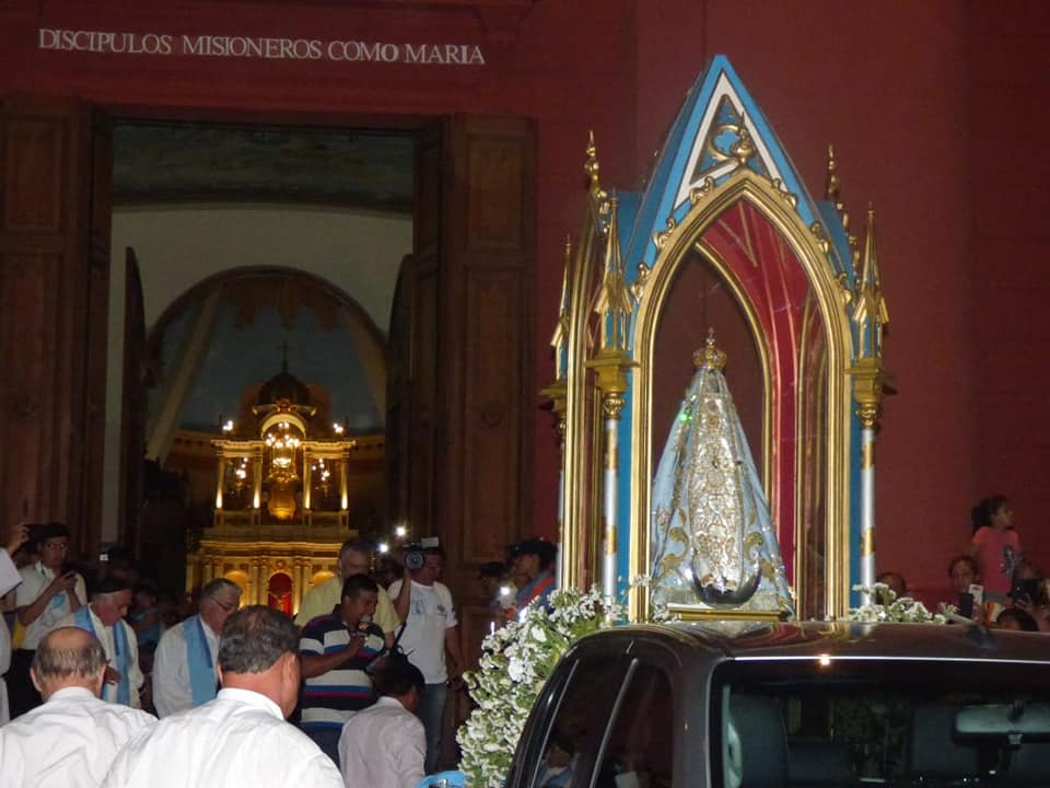 La Imagen de la Virgen del Valle bajó desde el Camarín hasta el Presbiterio de la Catedral Basílica y Santuario Mariano, en brazos del Obispo Diocesano, Mons. Luis Urbanc, acompañado por sacerdotes del clero catamarqueño.