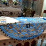 Los materiales usados son hilos dorados, cinta lurex, cristales facetados y un galón azul y dorado donado por una familia de Estados Unidos en acción de gracias por la curación de una niña.