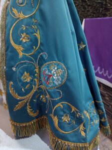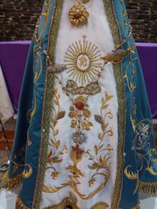 Los bordados fueron realizados con hilos de oro, se ven filigranas barrocas propias del estilo que la Sagrada Imagen lució en varios vestidos confeccionados por Rina del Valle Quiroga. También están el Escudo del Vaticano representando la universalidad de la Iglesia, que comparte la misión con nuestro Santuario de Catamarca, y el Escudo nacional, representando la soberanía de María sobre la nación argentina.