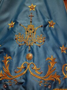 Lleva joyas donadas por fieles, rosas de Francia, brillantes y esmeraldas. En la parte inferior del manto se encuentra el anagrama de María. Las estrellas llevan cristales swarosky y cristalerías españolas.