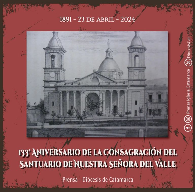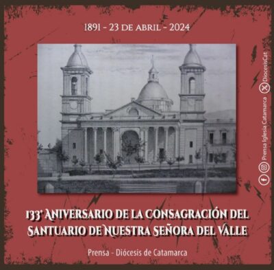 Hoy, 23 de abril, se cumple el 133° aniversario de la Consagración del Santuario de Nuestra Señora del Valle, a once días de la ceremonia de la Coronación de la venerada Imagen de nuestra Madre Morena. Casi dos décadas después, este templo pasaría a ser también Catedral, porque al crearse la Diócesis de Catamarca, en este lugar sagrado se establecería la sede -cátedra- del Obispo de la nueva Iglesia Particular.