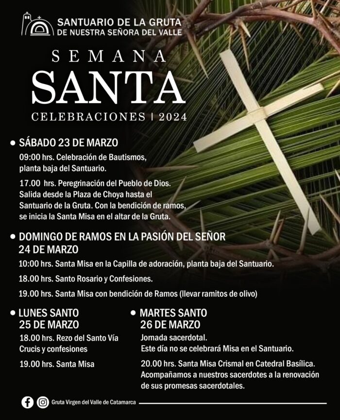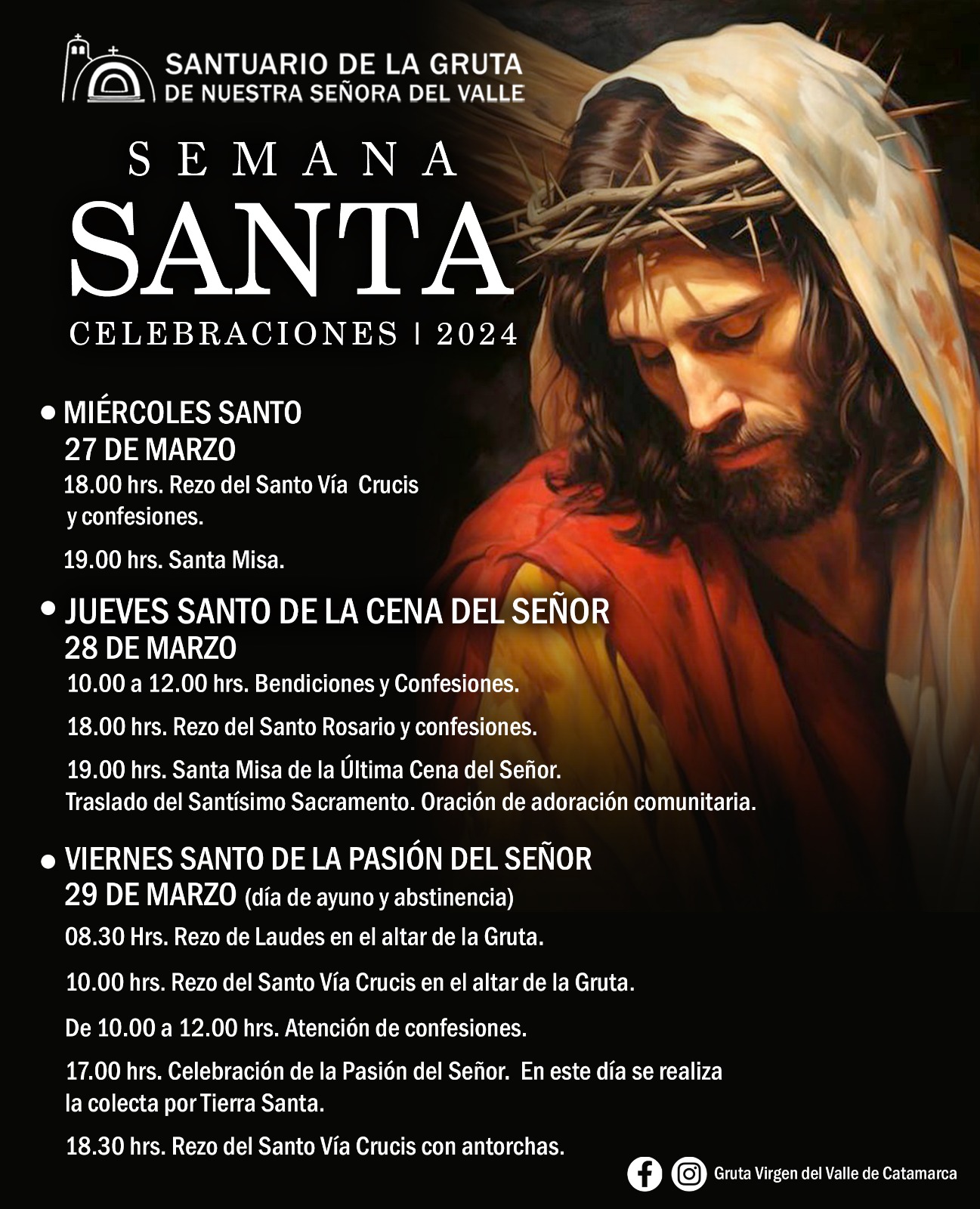 17.00- El obispo diocesano, Mons. Luis Urbanč, dará inicio al ejercicio de la Semana Santa con la peregrinación penitencial desde la Plaza del Choya hasta el Santuario de la Gruta de la Virgen del Valle. Antes de la Santa Misa bendecirá los ramos.