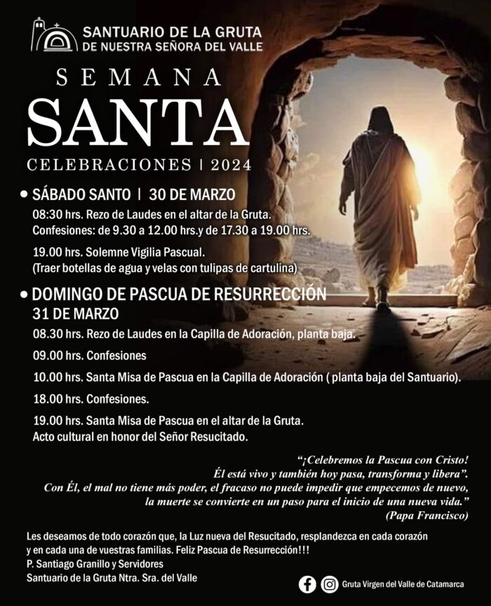 19.00- Santa Misa de Pascua en el altar de la Gruta.