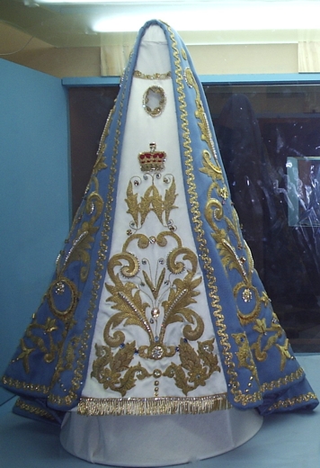 Confeccionado en raso color ocre suave. Continúa los motivos del manto, se repiten las mismas figuras y las aplicaciones de piedras de colores y tamaños variados.